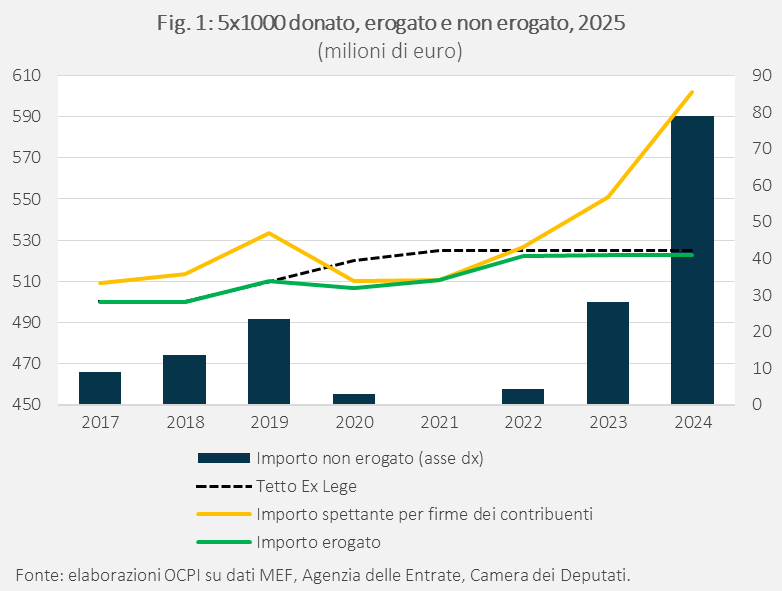 L’importo erogato per il 5 per mille nel 2025, relativo ai redditi del 2024, è stato di 525 milioni di euro. Questo importo è inferiore a quanto avrebbe dovuto essere erogato perché, a differenza dell’8 per mille, le risorse del 5 per mille, una volta che i contribuenti hanno espresso le proprie preferenze, vengono effettivamente stanziate entro un tetto annuale fissato dalla Legge di Bilancio, che nel 2025 era, appunto, di 525 milioni.[3] La parte trattenuta allo Stato non è irrilevante: nel 2024, a fronte di un gettito IRPEF di 221,6 miliardi, il 5 per mille equivaleva a 1,1 miliardi. Il 35% dei contribuenti ha scelto di firmare per il 5 per mille; essendo però contribuenti con reddito relativamente alto, la loro quota IRPEF ammontava al 55% del gettito totale IRPEF, per un importo da distribuire di 604 milioni. Rispetto al totale donato da questi contribuenti, sono stati erogati 79 milioni in meno; nel 2023 il divario era di 28 milioni, nel 2022 di 4 milioni (Fig. 1).