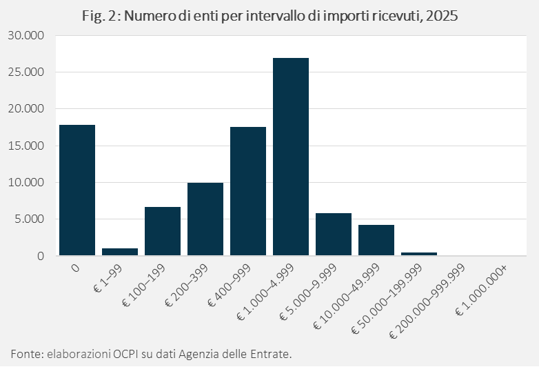 L’importo di 525 milioni, relativo al 5 per mille del 2024, è stato erogato a 71.730 enti. Il totale degli enti eligibili era molto più ampio (90.626). Infatti, 18.896 enti non hanno beneficiato di alcuna erogazione: la maggior parte (17.820 enti) non ha ricevuto preferenze; i restanti (1.076 enti) hanno ricevuto preferenze per importi inferiori a 100 euro. Infatti, se l’importo spettante è inferiore a tale soglia, la somma non viene corrisposta all’ente in questione, ma è redistribuita, nell’ambito della medesima finalità, agli enti per i quali è stata espressa una scelta valida (vedi Fig. 2 per la distribuzione degli enti in base agli importi ricevuti).