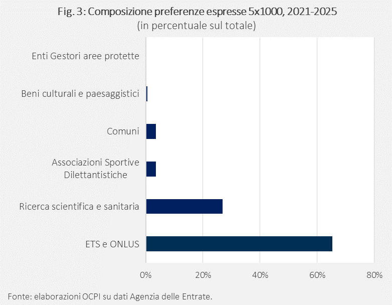 Tra i sette settori sopra indicati, quali sono quelli che ricevono più preferenze? Nel 2025, i beneficiari dei fondi sono concentrati prevalentemente tra gli enti del terzo settore (ETS) e ONLUS (65%) e la ricerca sanitaria e scientifica (27%); comuni, associazioni sportive, beni culturali e paesaggistici e aree protette ricevono, nel complesso, l’8% delle risorse, quasi esclusivamente per il contributo delle prime due voci (Fig. 3).