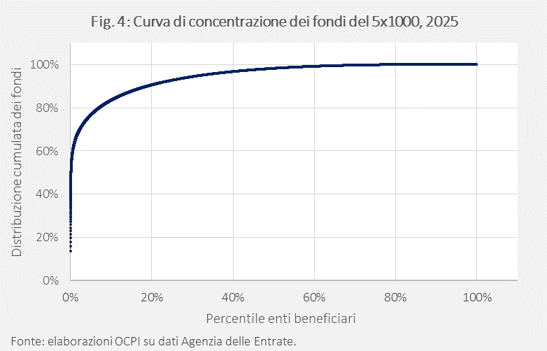 Il 5 per mille è lo strumento che offre ai contribuenti la possibilità di finanziare enti che operano in ambiti di utilità sociale (sanità, ricerca, cultura, diritti umani, ambiente). Negli anni, la presenza di un tetto massimo all’erogazione del 5 per mille ha talvolta comportato riduzioni dei fondi erogati rispetto alle scelte dei contribuenti. La distribuzione degli importi erogati nel 2025 (come negli anni precedenti) è fortemente concentrata su pochi grandi enti: su oltre 90mila enti eligibili, 100 ricevono più della metà dei fondi, mentre solo 4 enti il 20%. Il 69% dei fondi erogati ai primi 100 destinatari sostiene la sanità; di questi quasi la metà finanzia la sola ricerca oncologica.