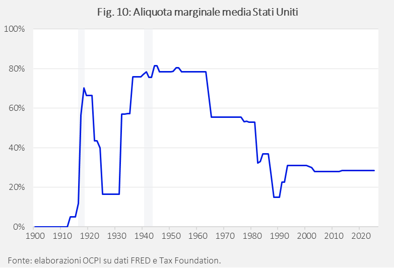 Durante le guerre aumenta anche il prelievo fiscale. Negli Stati Uniti, durante la Prima guerra mondiale, l’aliquota media di imposizione sui redditi (Federal Individual Income Tax Rates) passò dal 5% a oltre il 70%; nella Seconda aumentò anche la progressività: l’aliquota marginale massima arrivò al 94% nel 1944 (Fig. 10).