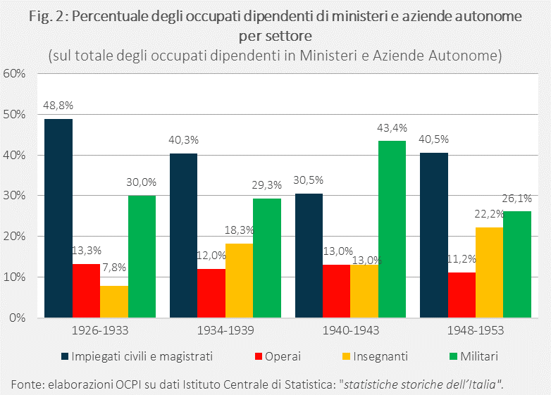 La riconversione industriale comporta anche una riallocazione della forza lavoro. In Italia, durante la Seconda guerra mondiale, il personale militare e gli operai aumentarono rispettivamente del 48% e dell’8%, mentre si ridusse l’occupazione degli altri settori: del 24% per gli impiegati civili e del 29% per gli insegnanti (Fig. 2).