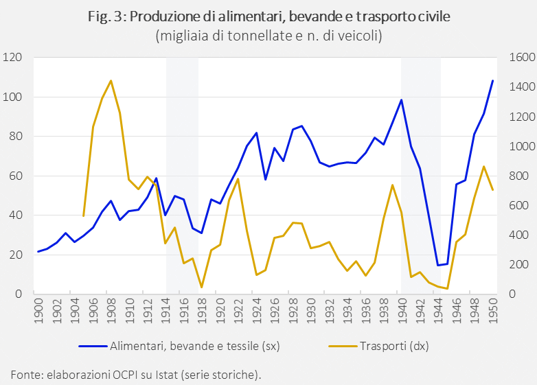 Nei Paesi in guerra è evidente il calo della produzione nei settori civili. Durante le due guerre mondiali, l’Italia registrò forti riduzioni nella produzione domestica di alimenti e bevande (zucchero, caffè, olio, birra e alcol), tessili e mezzi di trasporto a uso civile (Fig. 3).