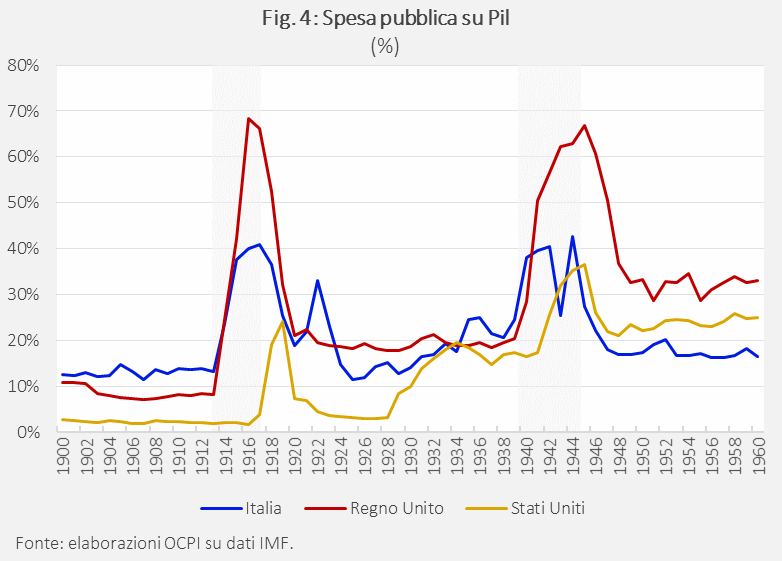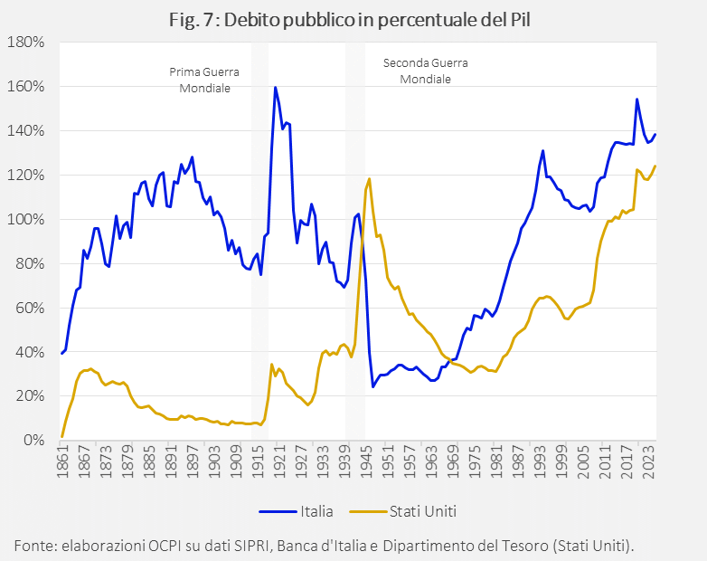 In Italia e negli Stati Uniti, il debito pubblico ha registrato gli aumenti più significativi in corrispondenza delle due guerre mondiali (Fig. 7).[13]