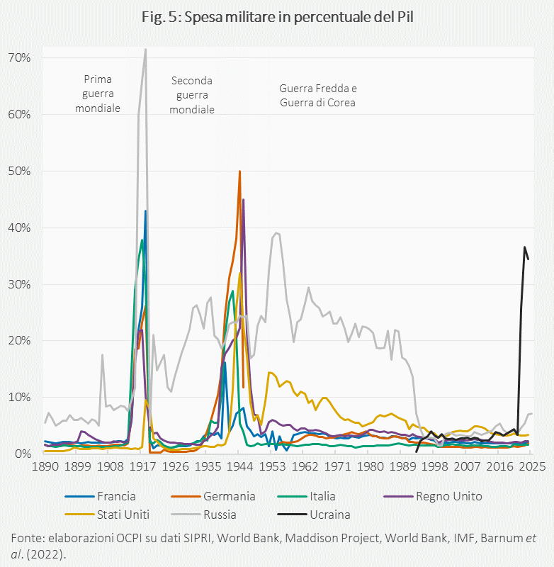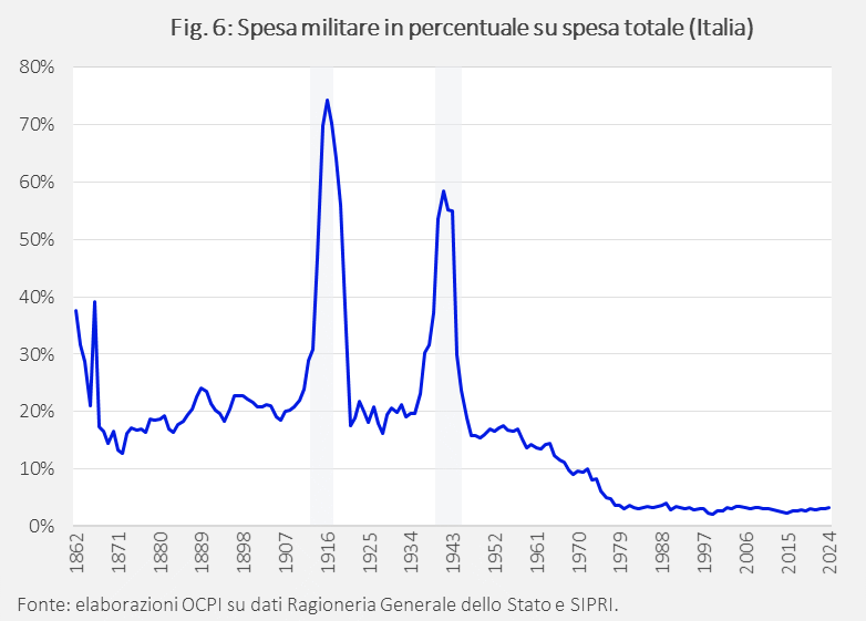 Durante le due guerre mondiali, la spesa pubblica, e in particolare quella militare, delle principali economie belligeranti esplose (Figg. 4 e 5).[10] Da valori intorno al 2% del Pil nel periodo prebellico, la spesa militare salì durante la Prima guerra mondiale al 39% in Francia, al 37% in Italia, al 26% in Germania e al 75% in Russia; nella Seconda, raggiunse il 45% in Germania, il 29% in Italia e il 26% negli Stati Uniti. In Italia, la spesa militare in rapporto alla spesa pubblica complessiva passò da meno del 20% prima dei conflitti a 74% nel 1917 e a 58% nel 1941; negli Stati Uniti sfiorò il 90% della spesa federale.[11] Oggi, in Italia, tale quota supera di poco il 3% (Fig. 6).
