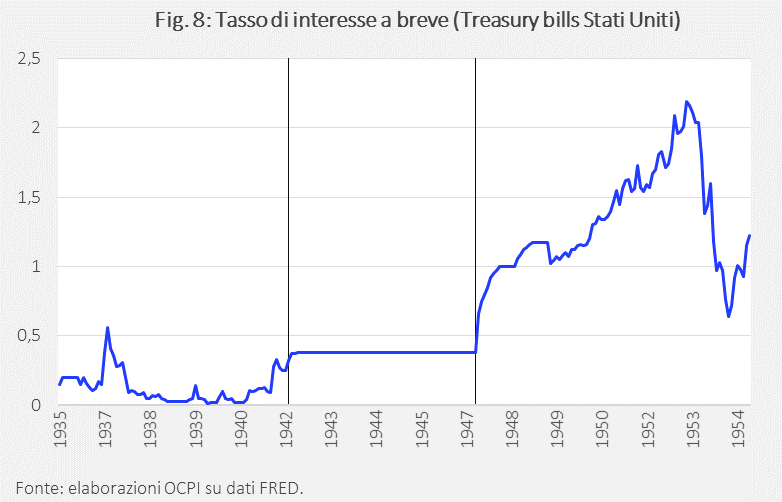 L’aumento del debito pubblico è spesso facilitato dal ricorso alla repressione finanziaria; questa implica raccogliere risorse a basso costo attraverso strumenti come i tetti ai tassi d’interesse, l’obbligo di acquisto di titoli di Stato e l’innalzamento delle riserve obbligatorie per le banche, per sterilizzare l’impatto inflazionistico del finanziamento monetario del deficit pubblico. È quanto accadde nel 1942 negli Stati Uniti, quando il tasso a breve termine fu imposto e bloccato allo 0,375%, nonostante l’alta inflazione (Fig. 8).[14] In Italia, durante la Seconda guerra mondiale, al finanziamento dello sforzo bellico contribuì la subordinazione del sistema bancario, largamente controllato dallo Stato tramite l’IRI. Le principali banche di proprietà pubblica canalizzarono il credito verso il Tesoro e le imprese impegnate nella produzione bellica a tassi di interesse contenuti e non determinati dal mercato.[15]