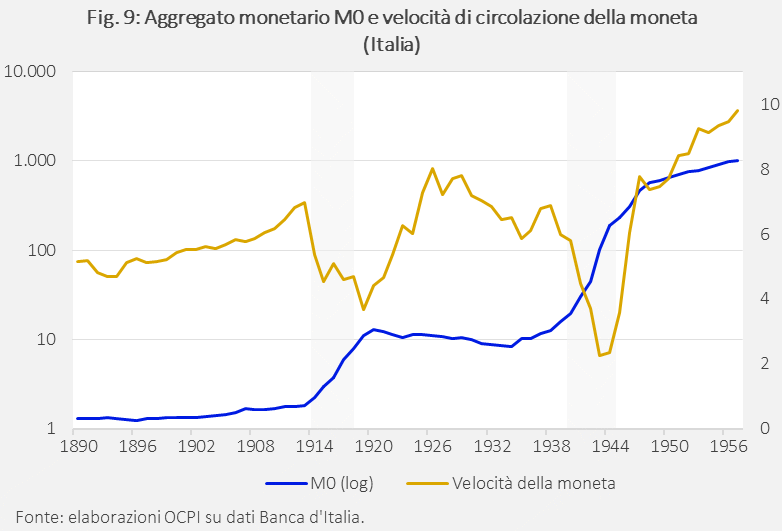 Il debito pubblico viene spesso finanziato dalla banca centrale, con conseguente espansione della base monetaria e del circolante detenuto dal pubblico. Nel caso italiano questa espansione venne accompagnata da una forte riduzione della velocità di circolazione della moneta (rapporto tra Pil e base monetaria), dovuta alle minori opportunità di spesa (dato il razionamento) e all’accumulo di risparmi in periodi di forte incertezza (Fig. 9).