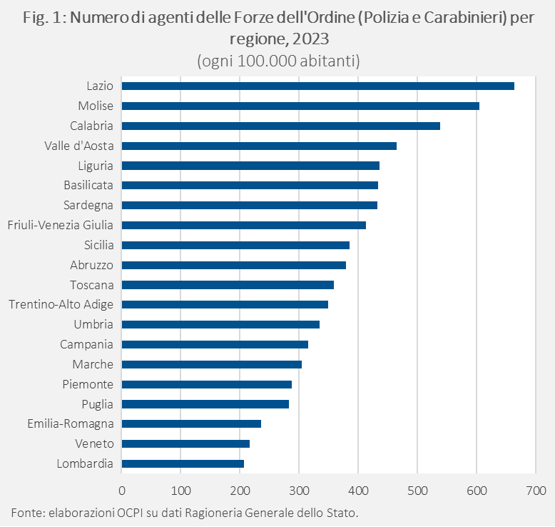 [5] I dati sul numero di agenti per regione provengono dal Conto Annuale della Ragioneria Generale dello Stato. Il Lazio è un outlier sia in termini di presenza delle Forze dell’Ordine (vista la localizzazione a Roma delle massime istituzioni dello Stato, dei comandi generali di Polizia e Carabinieri, delle principali ambasciate e organizzazioni internazionali) sia in termini di numerosità dei reati, dato l’elevato turismo e i crimini ad esso legati, come furti e borseggi. Per questo stesso motivo è elevato anche il tasso di criminalità in Toscana.
