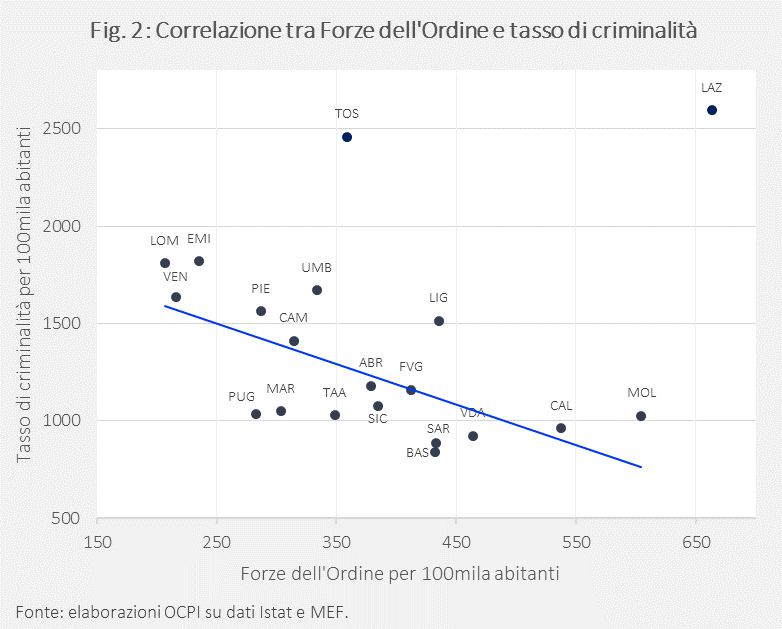 Analizzando la relazione tra l’indice di criminalità e il numero di agenti a livello regionale, emerge una correlazione negativa: dove il tasso di criminalità è alto, il numero di agenti per 100.000 abitanti è basso (Fig. 2).[5]