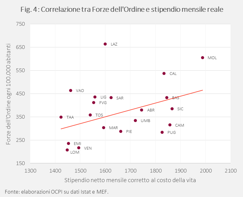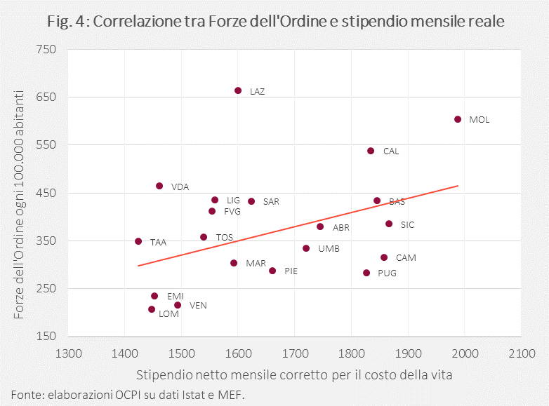 Questa nota conclude che la distribuzione territoriale delle Forze dell’Ordine in Italia sembra riflettere più le differenze nelle retribuzioni reali (che tengono conto del diverso costo della vita nelle varie regioni) che il diverso tasso di criminalità.