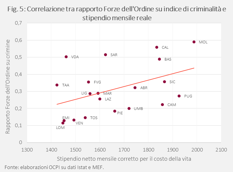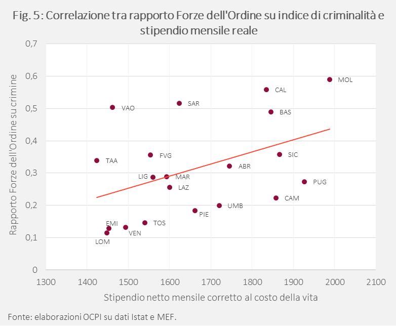 In una regressione tra numero di agenti (ogni 100.000 abitanti) per regione e salario reale regionale, si osserva una relazione positiva: dove le retribuzioni delle Forze dell’Ordine sono più elevate in termini reali (a causa del più basso costo della vita), il numero di agenti aumenta (Fig. 4). Nello specifico, un aumento di 10€ del salario reale è associato, in media, a circa 6 agenti in più ogni 100.000 abitanti (Vedi Tav. 2 in Appendice). Anche la regressione tra il rapporto Forze dell’Ordine/indice di criminalità e il salario reale restituisce un coefficiente positivo e significativo: un aumento del 10% del salario reale è associato a un aumento del 25% del rapporto Forze dell’Ordine/crimine (Fig. 5).