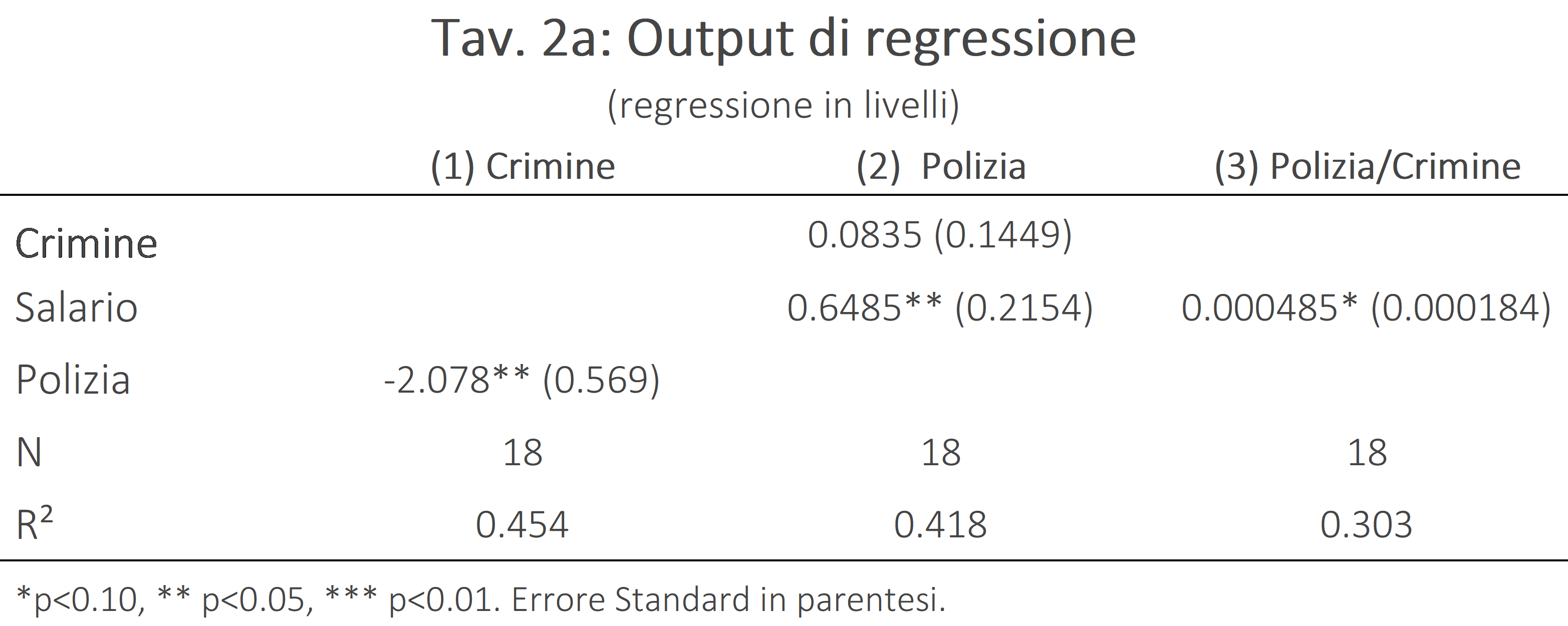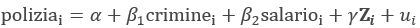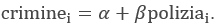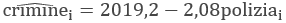 Dove criminei è il tasso di criminalità calcolato nel modo sopra descritto, e poliziai è il numero di agenti ogni 100.000 abitanti. Il coefficiente β misura quanto un agente in più, ogni 100.000 abitanti, riduca in media il numero di reati ogni 100.000 abitanti. La stima OLS dà: