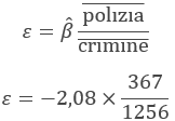 Quindi, la riduzione è di circa 2 reati per ogni nuovo agente. Il coefficiente della regressione in livelli può essere trasformato in elasticità (che coincide con il coefficiente che si otterrebbe in una regressione log-log):
