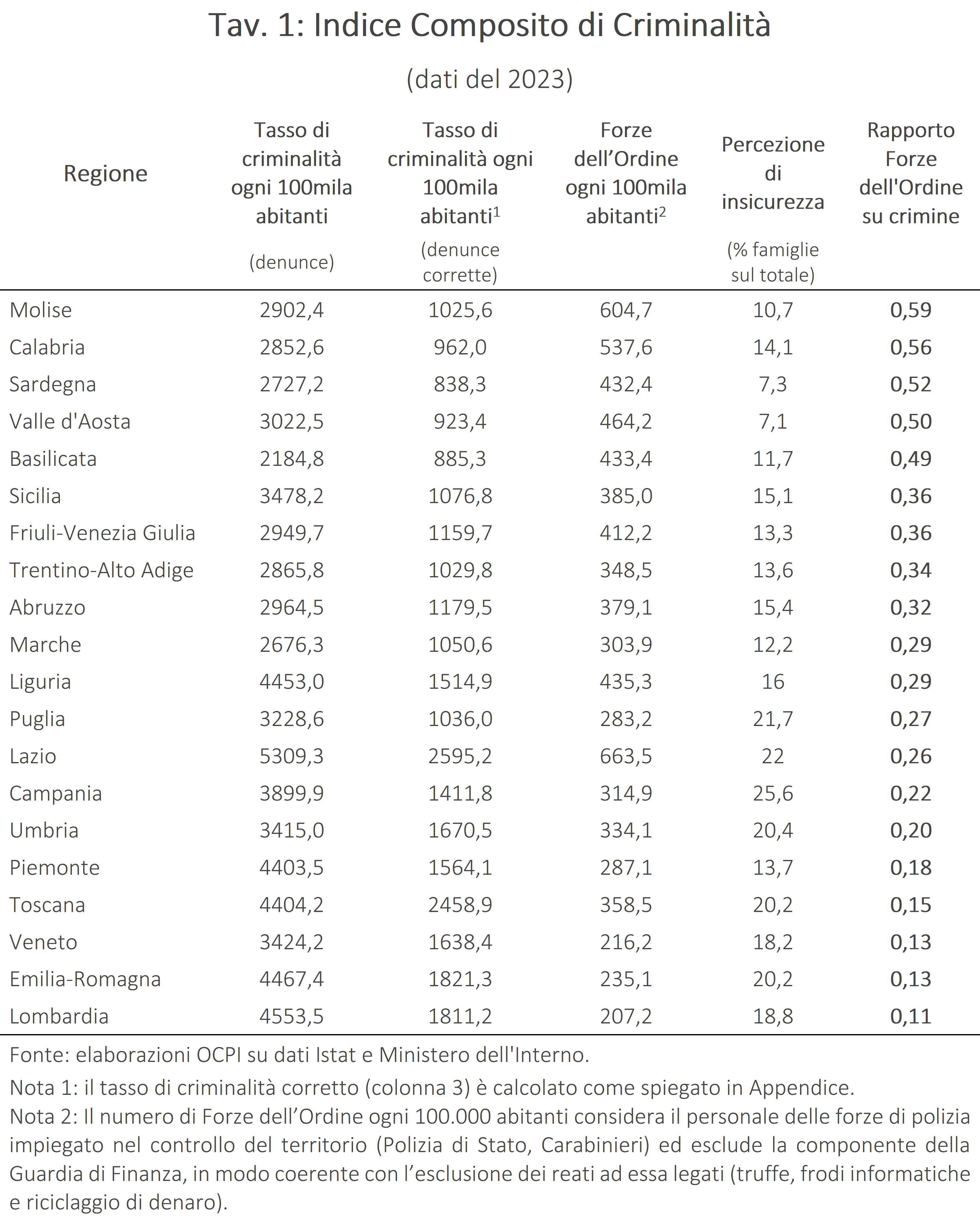 L’indice di criminalità per regione riportato nel testo di questa nota utilizza le statistiche sui reati denunciati all’Autorità Giudiziaria dalle forze di polizia.[13]