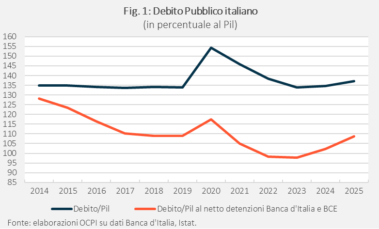 [1] Vedi “Pil e indebitamento delle AP - Anni 2023-2025”, Istat, 2 marzo 2026. Si tratta del debito delle pubbliche amministrazioni (“general government” nella terminologia inglese), che comprende lo Stato centrale e le amministrazioni locali.