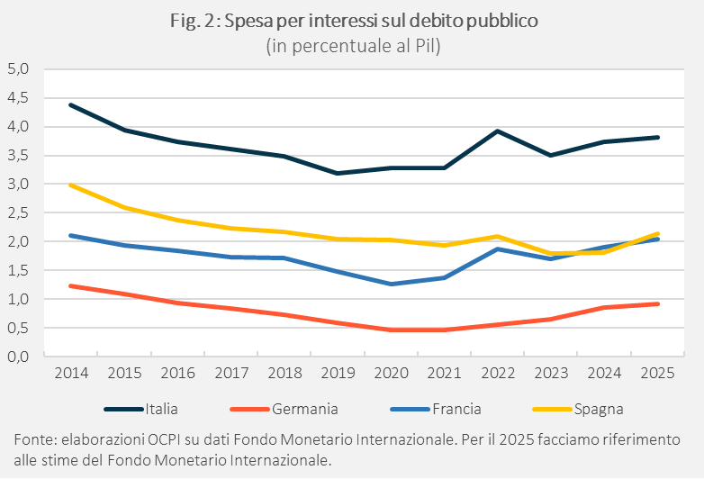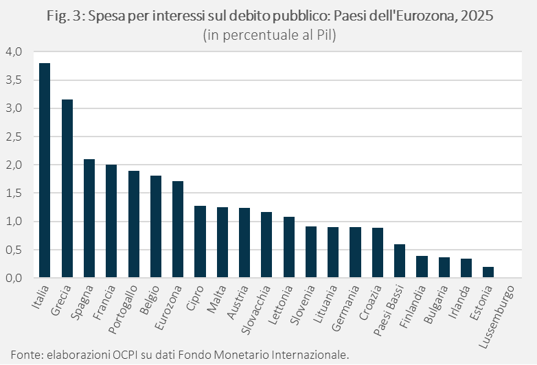 Nonostante la sostanziale stabilità del debito nell’ultimo decennio, la spesa per interessi rispetto al Pil è variata con l’andamento dei tassi di interesse. Con l’innalzamento di questi dal 2022 la spesa è tornata al 3,8% del Pil. Rispetto agli altri Paesi dell’eurozona l’Italia rimane al primo posto per spesa per interessi, ancora su livelli quasi doppi rispetto a Francia, Spagna e alla media dell’eurozona, e quattro volte più alti di quelli tedeschi (Fig. 2, Fig. 3).