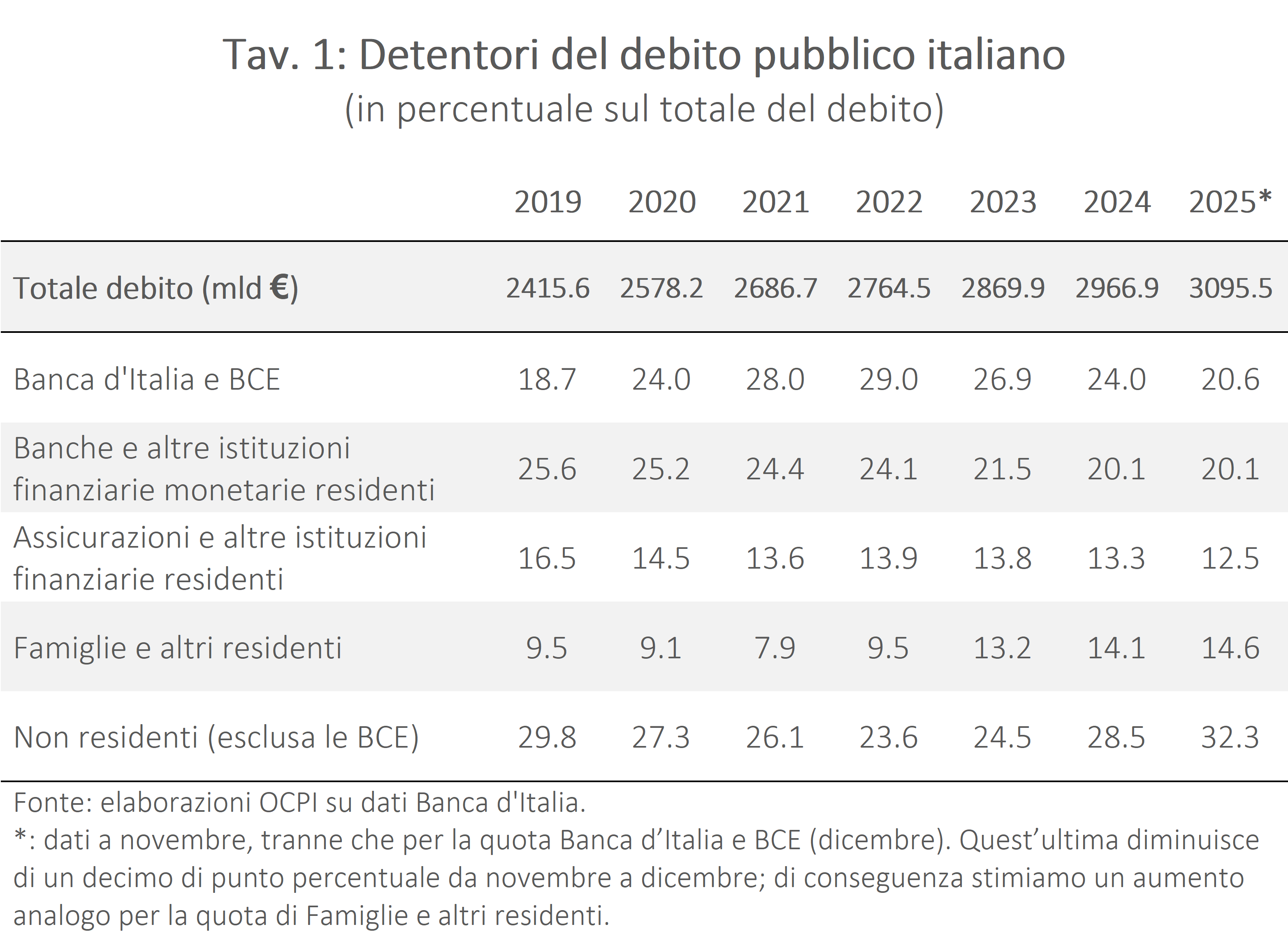 - Cala, in misura meno marcata, anche la quota in mano ad altre società finanziarie residenti (assicurazioni, fondi pensioni e fondi comuni di assicurazioni), passata dal 13,9% del 2022 al 12,5% del 2025.