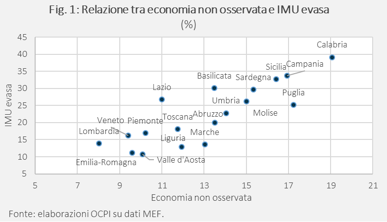 La percentuale di economia non osservata e la percentuale di IMU evasa sono correlate positivamente (Fig. 1). Le regioni del Mezzogiorno si collocano prevalentemente nella parte alta del grafico, con livelli più elevati sia di economia non osservata sia di evasione dell’IMU, con casi particolarmente marcati in Calabria, Campania e Sicilia. Al contrario, le regioni del Centro-Nord sono su valori più contenuti in entrambe le dimensioni.