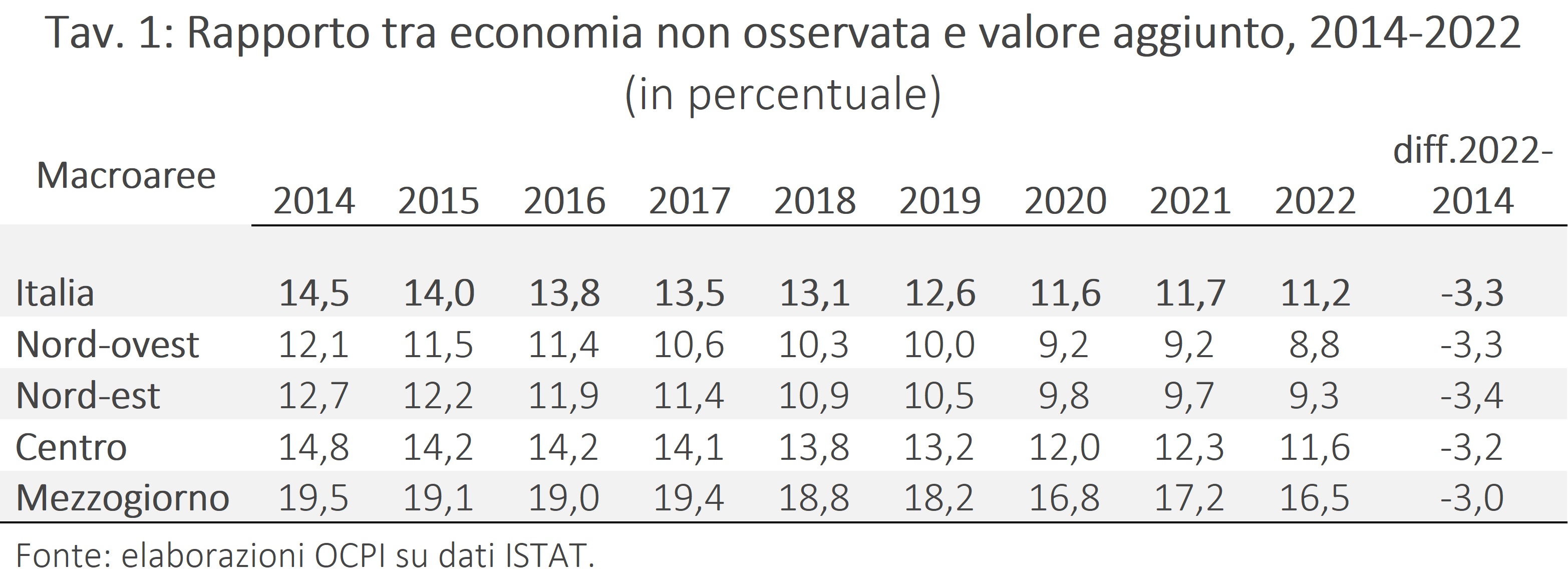 Per l’intero territorio nazionale, il rapporto tra economia non osservata e valore aggiunto è sceso di oltre tre punti percentuali tra 2014 e 2022, raggiungendo l’11,2% (Tav. 1).[3] Il calo è stato piuttosto uniforme, tra un massimo di 3,4 punti nel Nord-Est e un minimo di 3 punti nel Mezzogiorno. Le differenze sono però marcate in termini di livelli, con le aree Nord-est e Nord-ovest sotto il 10% nel 2022, mentre il Centro è lievemente sopra la media nazionale (11,6%) e il Mezzogiorno ampiamente al di sopra (16,5%).