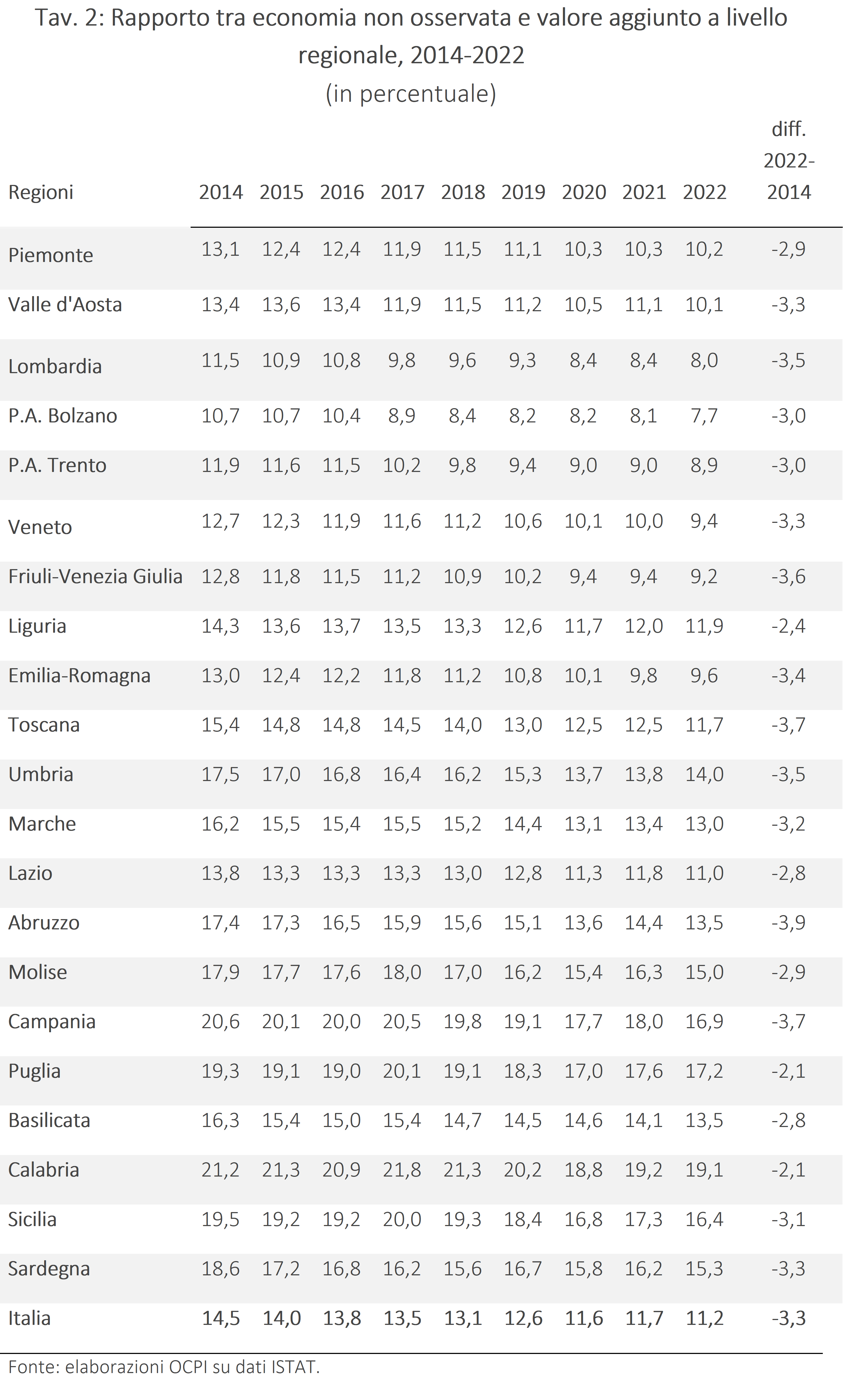 A livello regionale (Tav. 2), la regione con il calo maggiore è la Toscana (-3,7%), mentre Puglia e Calabria hanno il calo minore, al 2,1%. Nel 2014, nessuna regione aveva una percentuale di economia non osservata sotto il 10%, mentre nel 2022 ce ne erano sei, tutte nel nord Italia. La regione con l’incidenza più alta è la Calabria (19,1%), seguita da Puglia e Campania (17%). Le tre regioni con economia non osservata minore sono Provincia Autonoma di Trento (8,9%), Lombardia (8%) e Provincia Autonoma di Bolzano (7,7%).