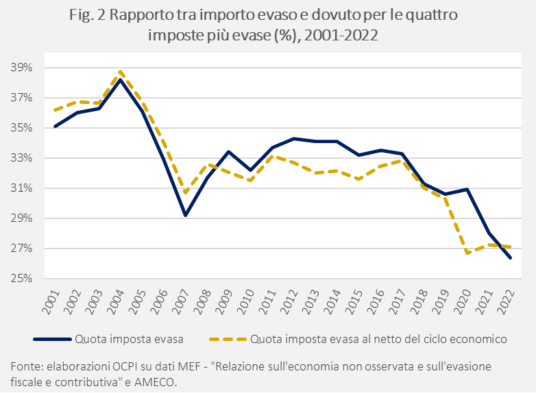 La quota di imposta evasa cala dal 35,1% del 2001 al 26,4% nel 2022 (Fig. 2, linea continua). Per valutare gli andamenti all’interno di questo periodo, è utile depurare la quota di evasione per gli effetti del ciclo economico. È infatti ragionevole pensare che l’evasione tenda a crescere in periodi di recessione, vista la minore liquidità che le imprese hanno in tale periodo.[8] Al netto degli effetti ciclici (Fig. 2, linea tratteggiata), dopo un picco di evasione raggiunto nel 2004 (39%), emergono tre periodi:
