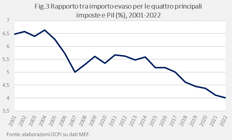 - tra il 2004 e il 2007, l’evasione scende rapidamente;
