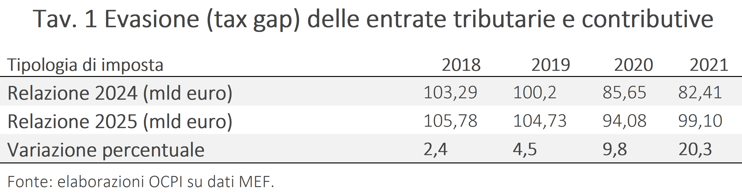 Ogni anno, una Commissione indipendente, ma istituita dal Ministero dell’Economia e delle Finanze (MEF), prepara una Relazione sull’economia non osservata e sull’evasione fiscale e contributiva in Italia.[2]