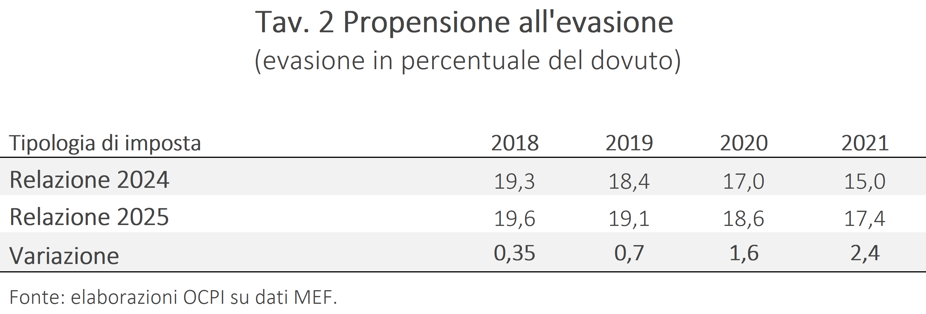 Per il periodo 2018-2021, l’evasione appare più alta di quanto stimato in precedenza, con una differenza crescente nel tempo (Tav. 1): nel 2018 le nuove stime sono più alte del 2,4%, mentre nel 2021 la revisione sale al 20,3%. Anche in percentuale di quanto dovuto, la revisione cresce: dallo 0,3% del 2018 al 2,4% nel 2021 (Tav. 2). Secondo la Relazione, le nuove stime riflettono la revisione quinquennale dei Conti nazionali del 2024 e un nuovo metodo di stima dell’evasione da IRPEF da lavoro autonomo e d’impresa.[4]
