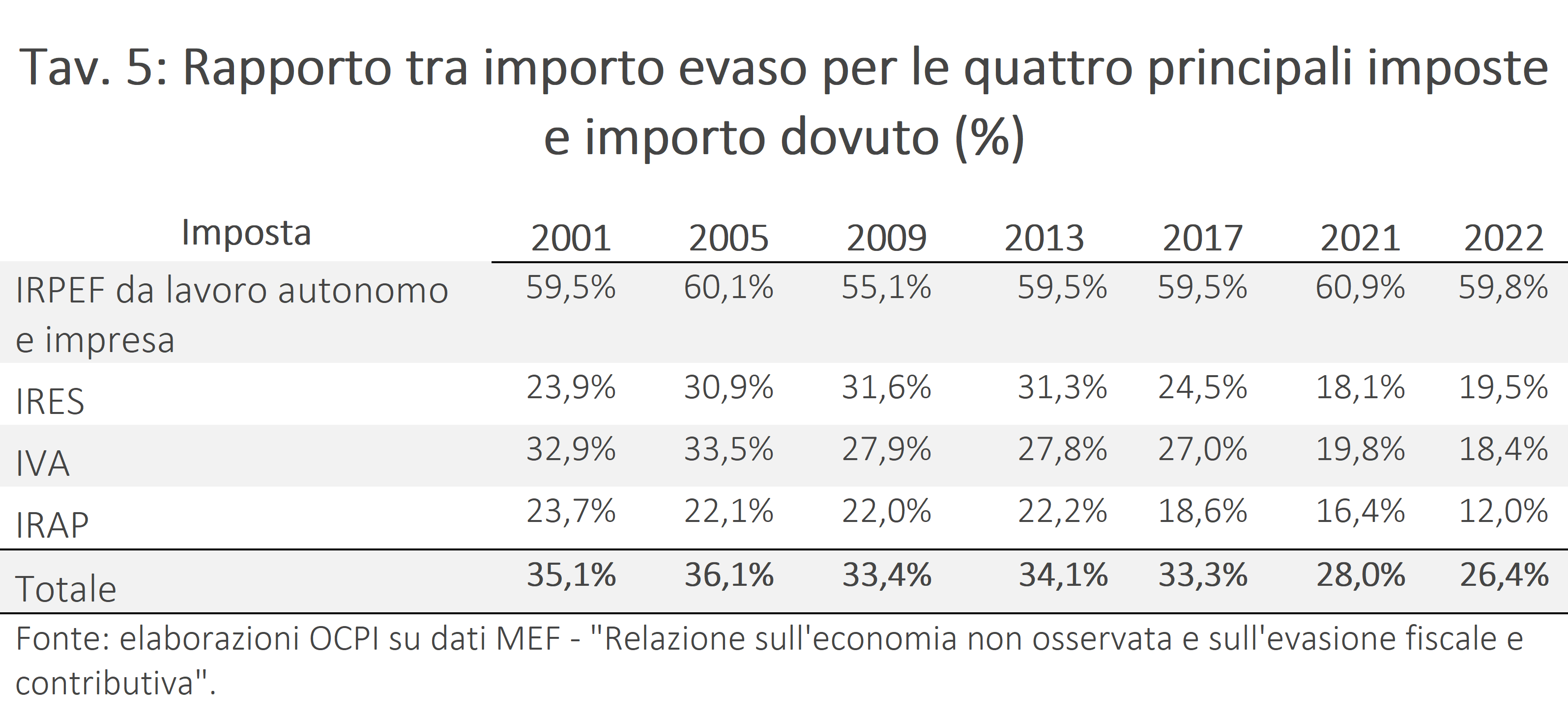 La Relazione 2025 presenta anche serie storiche per il periodo 2001-2022 relative alle principali imposte per evasione, ossia IRPEF da lavoro autonomo e d’impresa, IRES, IVA e IRAP (rappresentanti l’89% dell’evasione nel 2022).