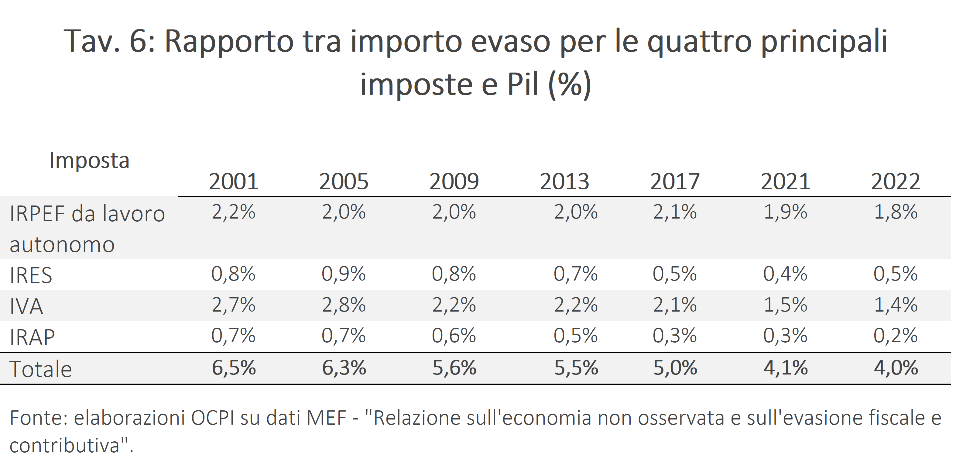 L’evasione per queste imposte è scesa dal 6,5% del Pil nel 2001 al 4% nel 2022 (Fig.3). Il calo è stato più marcato tra il 2005 e il 2007 (con una risalita nel 2008-09 dovuta alla riduzione del Pil e all’aumento congiunturale dell’evasione: vedi sopra) e dal 2016 al 2022. A livello di singola imposta (Tav. 6), tutte mostrano un calo del rapporto: tra 2001 e 2022, l’IRPEF da lavoro autonomo e d’impresa scende dal 2,8% al 2,2%, mentre l’evasione si dimezza rispetto al Pil per IVA, IRES e IRAP.
