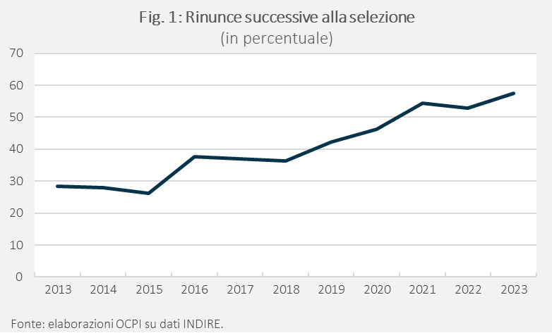 Il limitato interesse delle imprese per diplomati ITS, porta poi come conseguenza il limitato interesse dei giovani per continuare il percorso educativo. Perché proseguire negli studi se si trova facilmente lavoro con un diploma di secondo grado? Questa situazione spiegherebbe anche l’elevata quota di rinunce che gli ITS ricevono da giovani dopo che sono stati selezionati: nel 2023 circa il 60% degli idonei, che avevano inizialmente fatto domanda di iscrizione, ha scelto di non iscriversi ai percorsi, una percentuale in crescita nel tempo (Fig. 1).