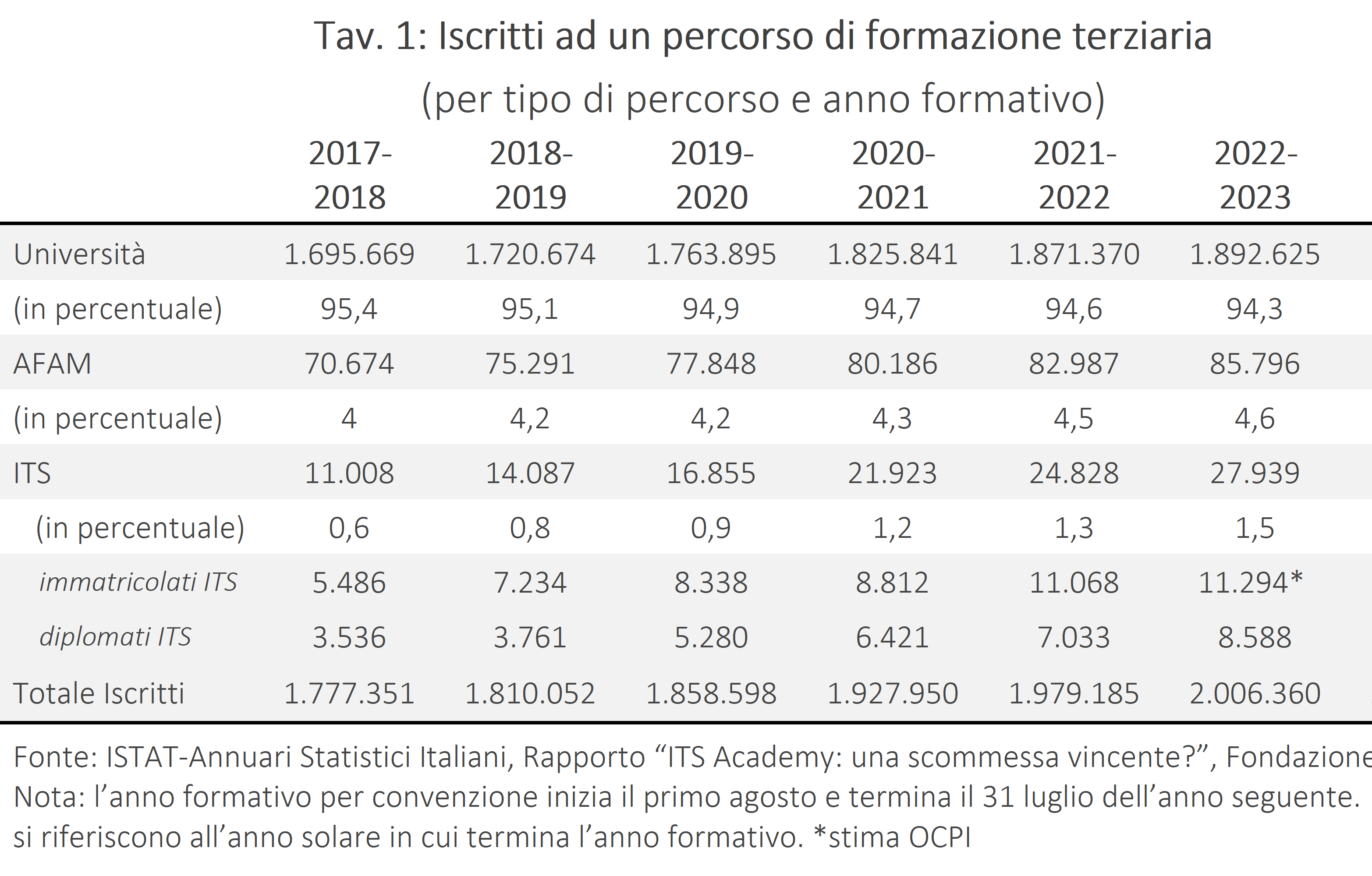 Nel 2024, solo il 36,1% degli italiani tra i 25 e i 34 anni aveva conseguito un titolo di istruzione terziaria, il secondo dato più basso in Europa, con un distacco netto rispetto a Francia (53,4%), Spagna (52,6%) e Germania (39,9%).[1] Parte di questo divario si spiega col limitato sviluppo in Italia di percorsi terziari a indirizzo tecnico-professionale, più sviluppati all’estero. Nonostante esista dal 2007 un canale dedicato a questo tipo di formazione – gli Istituti Tecnologici Superiori (o ITS Academy, d’ora in poi, “ITS”) – sempre nel 2024, la quota di giovani tra i 25 e i 35 anni con un titolo terziario a indirizzo tecnico- professionale, rispetto al totale di quelli con un titolo di istruzione terziaria era solo dell’1%.[2] Si tratta di un valore molto inferiore al 29,2% della Francia, il 22,3% della Spagna e il 15,1% della media OCSE.[3] Solo di poco più alto era il numero degli iscritti negli ITS nell’anno formativo 2023/24: seppur in crescita costante, erano meno del 2% degli iscritti a un percorso di formazione terziaria e meno della metà degli iscritti a corsi di formazione artistica, musicale e coreutica (Tav. 1).[4]