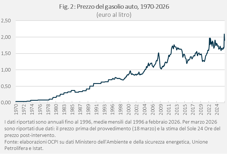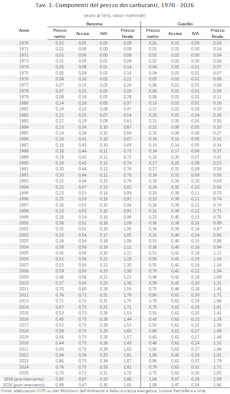 Dopo l’attacco di Stati Uniti e Israele all’Iran il prezzo dei carburanti è salito molto, superando 1,80 euro al litro per la benzina e 2 euro per il gasolio. Ciò ha spinto il governo a tagliare le accise di 20 centesimi, con un taglio complessivo dell’imposizione di 24,4 centesimi tenendo conto del calo dell’IVA: a parità del prezzo pre-imposte, il prezzo dovrebbe scendere a 1,65 euro al litro per la benzina e a 1,90 per il gasolio. Considerando i prezzi al netto dell’inflazione, il livello pre-intervento della benzina non era particolarmente alto, essendo in linea con la media degli ultimi 55 anni. Dopo l’intervento, il prezzo scenderebbe a un livello tra i più bassi in oltre mezzo secolo. Il prezzo del gasolio era invece superiore alla media degli ultimi vent’anni, che però era tenuta bassa dalla più contenuta imposizione su questo carburante; dopo l’intervento si riavvicinerebbe alla media, restando di poco superiore.