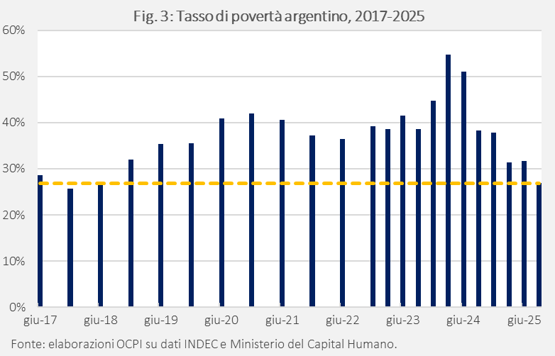 Mostra segnali positivi il tasso di povertà, che dopo l’impennata a inizio 2024 è sceso gradualmente fino al 27% del terzo trimestre del 2025, il valore più basso dal 2018 (Fig. 3).[6] Anche l’indice di Gini, che misura la disuguaglianza dei redditi, dopo lo shock del 2024 è tornato ai livelli pre-Milei, pur rimanendo su valori elevati.
