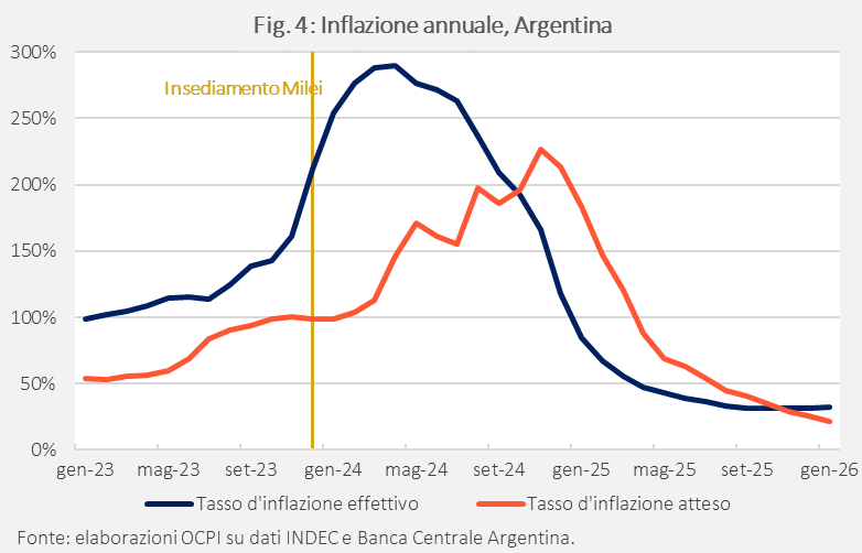 Il programma Milei ha infatti portato a un forte calo dell’inflazione, uno dei problemi maggiori e persistenti dell’economia argentina: dopo un iniziale aumento, legato alla svalutazione del cambio a fine 2023, la discesa è stata molto veloce e superiore alle aspettative, ma da settembre 2025 in poi il tasso d’inflazione a 12 mesi si è stabilizzato intorno al 32% (Fig. 4).