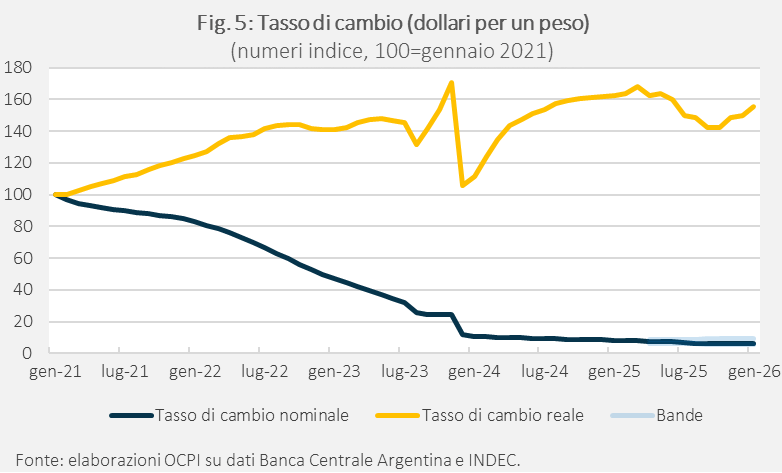 Con la rimozione l’11 aprile 2025 dei controlli sui capitali descritti a inizio nota, è entrato in vigore un nuovo regime di cambio in cui il peso fluttua liberamente all’interno di due bande, allargate prima dell’1% ogni mese, poi, dal 1° gennaio 2026, del tasso d’inflazione mensile di due mesi prima.[7] Nel nuovo sistema la banca centrale interviene solo se il peso rischia di uscire dalle bande, acquistando pesos e vendendo dollari.