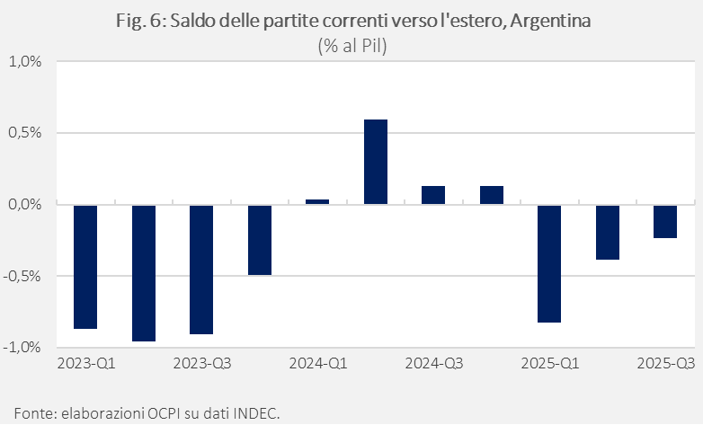 Questo apprezzamento è stato accompagnato da un peggioramento delle partite correnti della bilancia dei pagamenti: le esportazioni sono scese e le importazioni sono aumentate, anche per la rimozione dei dazi. Il saldo delle partite correnti, dal surplus della prima parte del 2024, è entrato in deficit nel 2025 (Fig. 6).