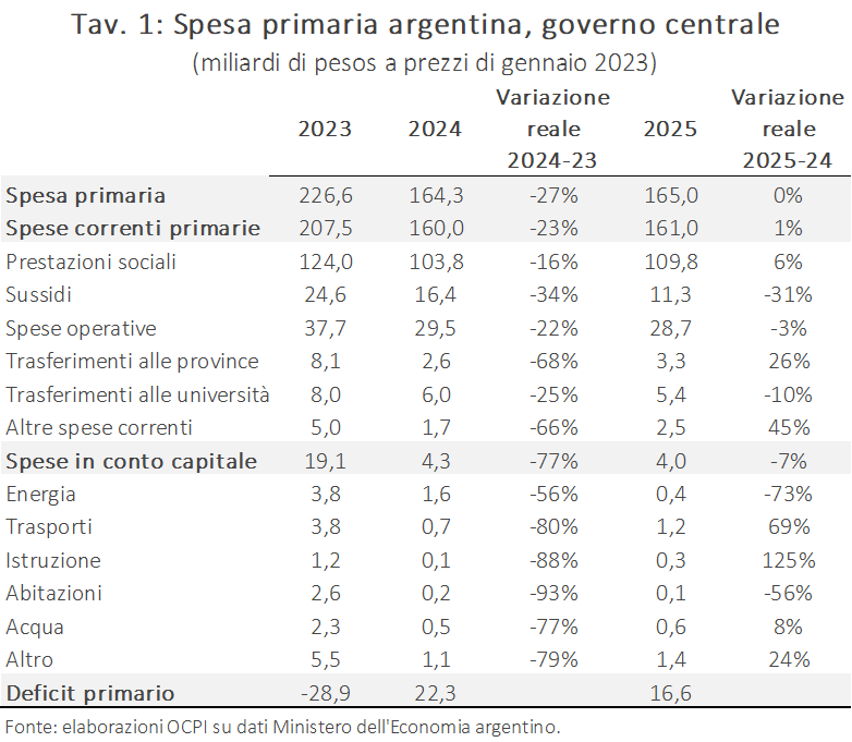 Riguardo al bilancio pubblico, la spesa primaria (cioè al netto degli interessi sul debito), dopo un taglio del 27% in termini reali tra 2023 e 2024, è rimasta stabile nel 2025: l’ulteriore taglio ai sussidi è stato compensato dall’aumento della spesa pensionistica (Tav. 1). Senza grandi cambiamenti sul lato delle entrate, il bilancio dopo il deficit del 2023 (5,3% del Pil) ha raggiunto nel 2024 e nel 2025 un surplus rispettivamente dello 0,4% e 0,5% del Pil. Grazie anche all’aiuto dell’ancor forte inflazione, il rapporto tra debito pubblico e Pil è così sceso dal 155% del 2023 all’85% del 2024 e al 79% nel 2025.[3]