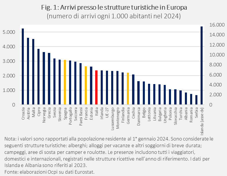 - Nel 2024 si sono registrati in Italia 2.368 arrivi in strutture ricettive ogni 1.000 abitanti (da parte di viaggiatori italiani e stranieri), più che in Germania (2.213) e della media UE (2.346), ma meno che in Francia (2.645) e in Spagna (3.078, Fig. 1).