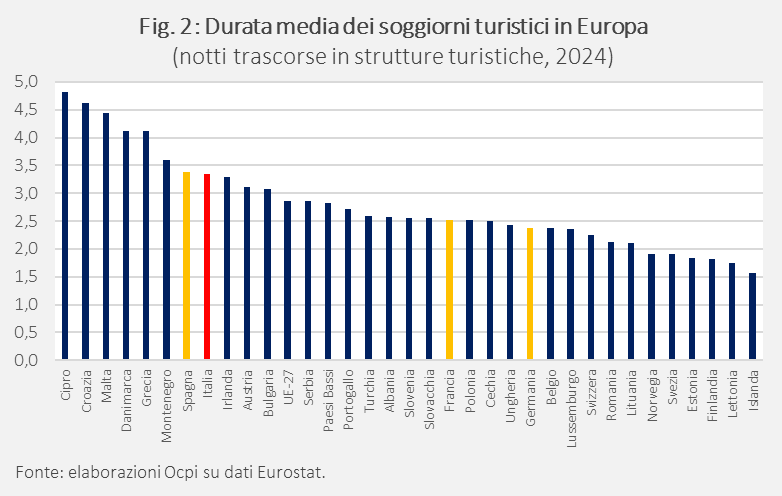 - Il nostro rientra tra i Paesi europei con la durata media dei soggiorni nelle strutture turistiche più alta: 3,3 notti, simile al livello della Spagna (3,4) e superiore alla media UE (2,9). Più brevi invece i soggiorni in Francia (2,5) e Germania (2,4, Fig. 2).