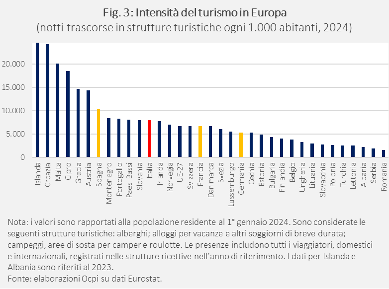 Nel complesso, tenendo conto sia del numero di viaggiatori sia della durata media dei soggiorni, l’Italia nel 2024 ha registrato 7.905 notti ogni 1.000 abitanti, un valore superiore alla media UE (6.725) e a quello di Francia (6.684) e Germania (5.268), ma inferiore rispetto alla maggior parte dell’Europa meridionale (14.705 in Grecia, 10.390 in Spagna e 8.278 in Portogallo). Ai primi posti in Europa si collocano l’Islanda (25.548), la Croazia (24.248) e le isole di Malta (20.091) e Cipro (18.533; Fig. 3). L’Italia è al dodicesimo posto in classifica. A livello nazionale, non emerge dunque un’intensità particolarmente elevata del turismo in Italia.