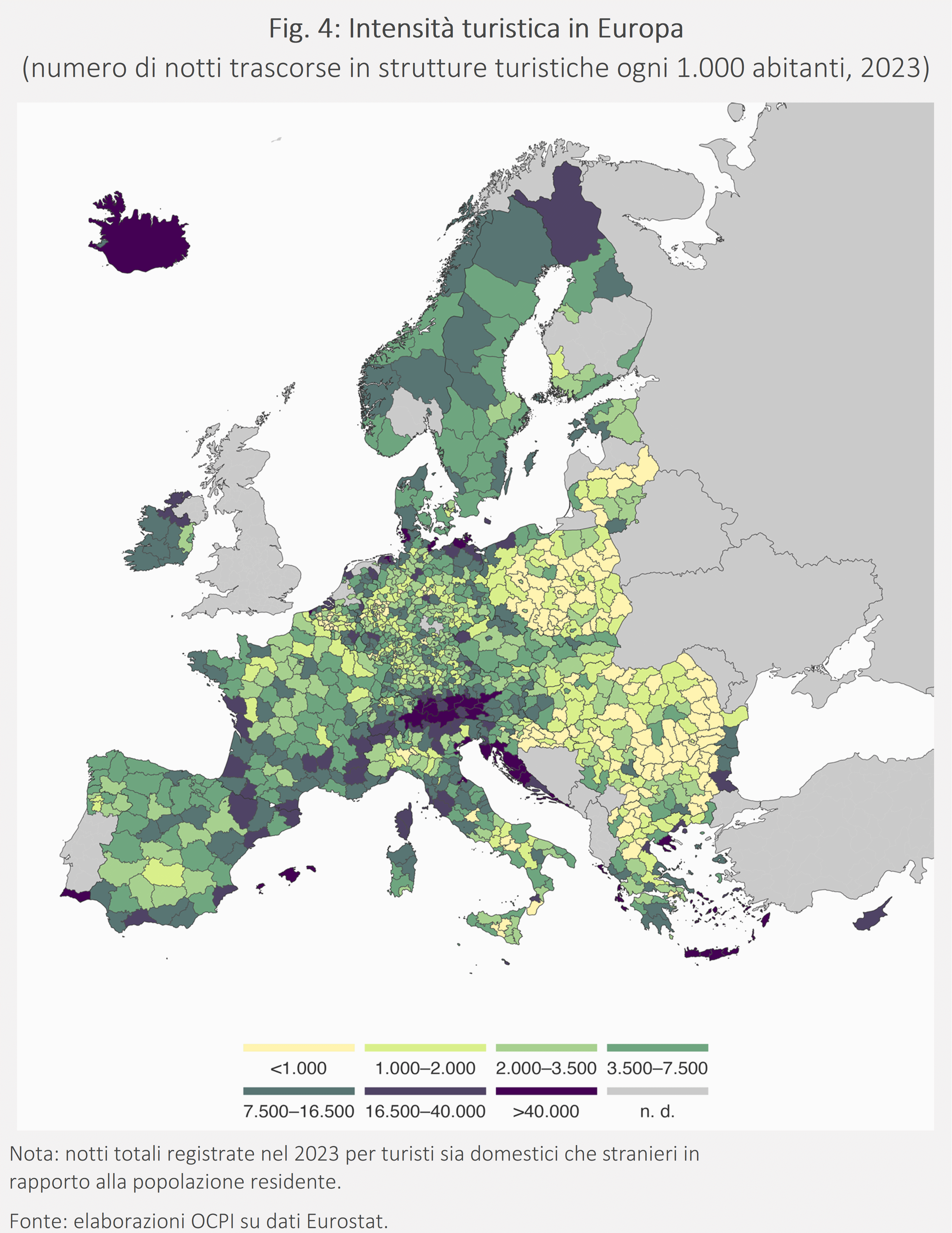 Le misure aggregate nazionali possono però non riflettere la distribuzione del turismo all’interno di un Paese e nascondere criticità locali. A parità di turisti, la concentrazione in poche destinazioni può generare sovraffollamento e accentuare la percezione del problema nell’opinione pubblica.
