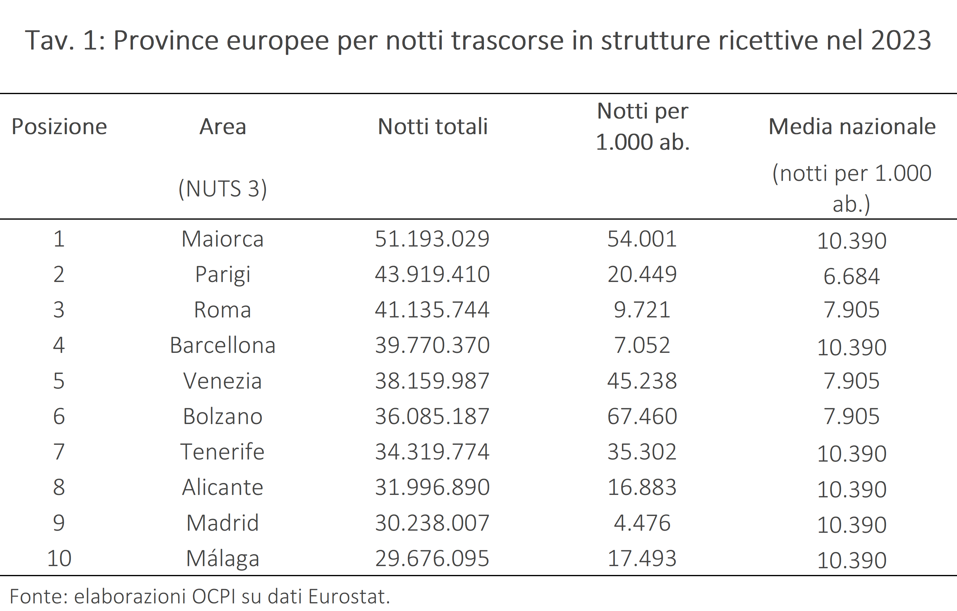 Le differenze tra le diverse aree geografiche all’interno dell’Italia sono marcate. Nel 2023, la provincia autonoma di Bolzano ha registrato 67.460 notti trascorse in alloggi turistici ogni 1.000 abitanti (il valore più elevato in Italia), la provincia di Venezia 45.238 notti e quella di Roma 9.721, contro una media nazionale di 7.905 notti (Tav. 1).[3]