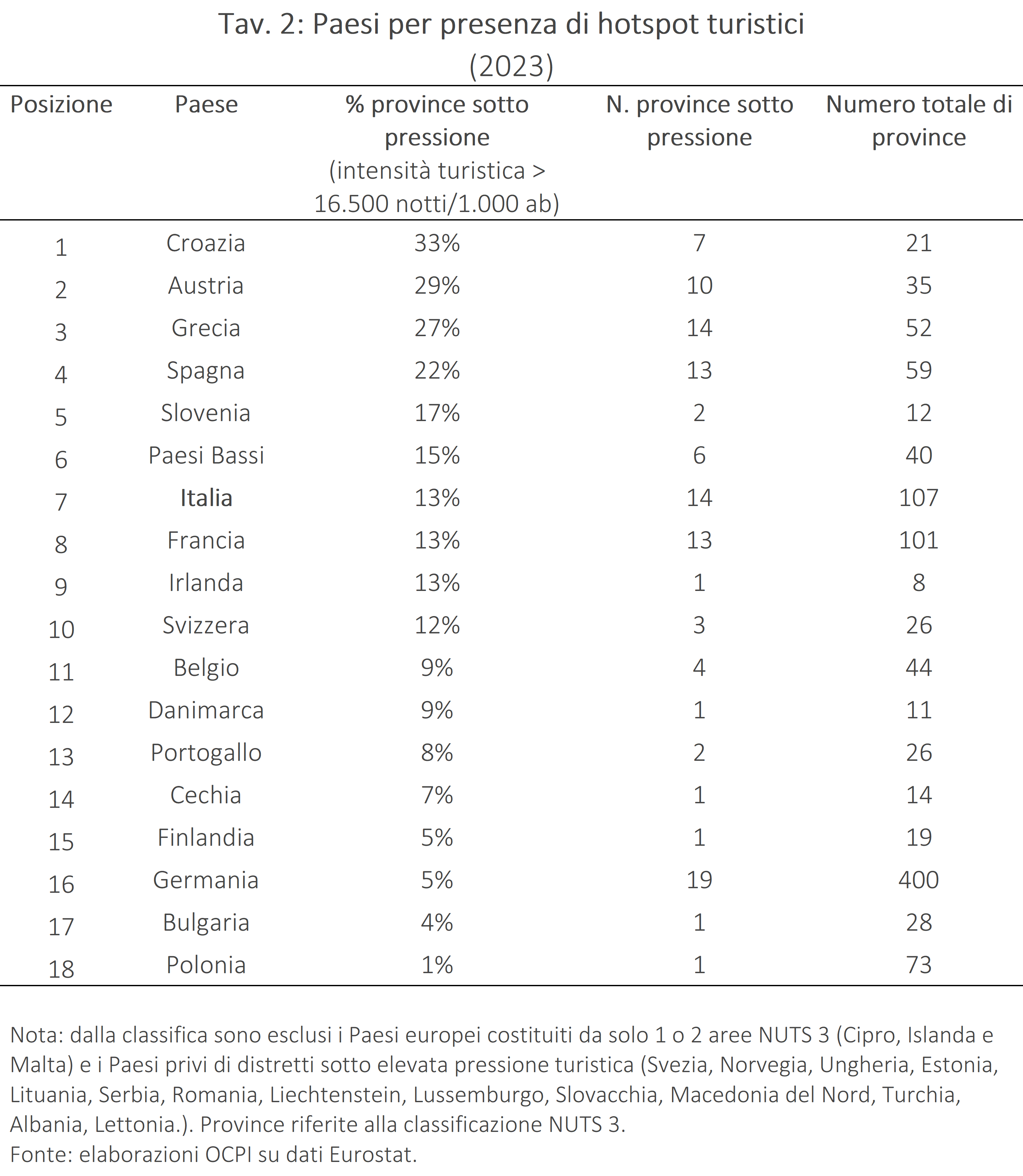 È proprio guardando dentro i confini nazionali di ogni Paese, che emergono le differenze più rilevanti. Come riportato nella Tav. 2, nel 2023 l’Italia era al settimo posto nella classifica per percentuale delle province (o unità amministrative di estensione confrontabile) con intensità elevata di turisti (oltre 16.500 notti ogni 1.000 abitanti, rappresentate nella Fig. 4 dai due colori più scuri). Guidano la classifica Croazia (33%), Austria (29%) e Spagna (27%). In Italia sono sotto alta pressione 14 province, il 13% del totale. Dopo Bolzano e Venezia, le province sotto alta pressione sono Rimini (43.618 notti ogni 1.000 abitanti), Trento (35.306), Aosta (29.760) e le aree marittime di Livorno (28.264) e Grosseto (27.059).