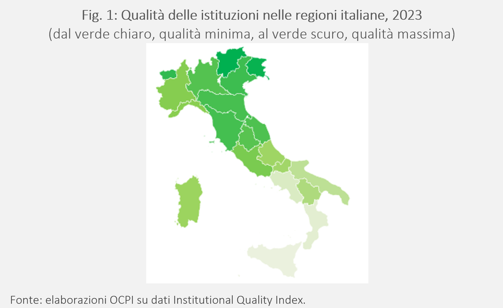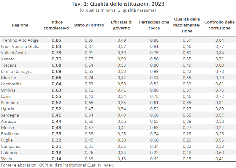 La qualità delle istituzioni è un fattore determinante per lo sviluppo economico e sociale di un Paese. Per misurarla, un indicatore spesso utilizzato per l’Italia è l’Indice di Qualità Istituzionale (IQI), ideato da due studiosi dell’Università del Sannio (Benevento) e dell’Università Federico II (Napoli), che, utilizzando indicatori oggettivi, considera cinque dimensioni: stato di diritto, efficacia di governo, partecipazione civica, qualità della regolamentazione, controllo della corruzione. Tra il 2004 e il 2023 la qualità delle istituzioni nel Paese è rimasta sostanzialmente stabile: il peggioramento dell’indice nelle regioni e province del Nord è stato compensato da un miglioramento del Centro, con le due aree che oggi hanno punteggi molto simili. Il distacco tra Mezzogiorno e resto del Paese si è ridotto solo modestamente e rimane molto ampio: nel 2023 Nord e Centro avevano valori più che doppi rispetto a Sud e Isole, e nessuna regione del Mezzogiorno aveva un punteggio pari o superiore a una del Centro-Nord. Il divario è presente in tutte le dimensioni dell’indice. I divari territoriali sono confermati da altri tre indici, uno incentrato sulla dotazione infrastrutturale, uno basato esclusivamente su sondaggi che misurano la percezione dei cittadini e uno su dati misti: nella media degli indici le regioni migliori sono Valle d’Aosta, Friuli e Trentino; la peggiore è la Sicilia, seguita da Calabria e Campania.