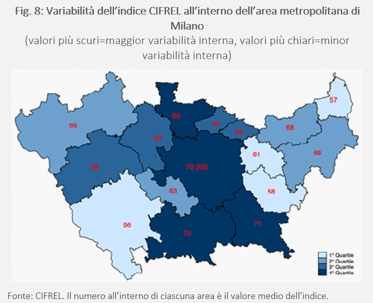 - Un indice sviluppato da economisti dell’Università Cattolica del Sacro Cuore sulla dotazione infrastrutturale e la qualità dei servizi sul territorio nazionale.[6] L’indice integra variabili relative a molteplici settori: istruzione (dotazione degli edifici scolastici, risultati INVALSI, posti disponibili negli asili nido), sanità (posti letto ospedalieri e qualità del servizio sanitario sulla base del Nuovo Sistema di Garanzia per il monitoraggio dei LEA, presenza del pronto soccorso, disponibilità di farmacie e consultori), giustizia (numero di magistrati civili, disposition time e clearance rate dei tribunali), assistenza sociale (posti disponibili per assistenza sociale), digitale (accesso delle famiglie alla banda ultra-larga FTTH), trasporti (accessibilità a stazioni ferroviarie e svincoli autostradali), energia (durata media delle interruzioni di corrente senza preavviso), acquedotti (perdite di rete idrica) e gestione dei rifiuti (percentuale di rifiuti raccolti in modo differenziato, smaltiti in discarica, ed esportati fuori regione). L’indice – qui aggregato a livello regionale per finalità di confronto con le altre misure – è calcolato a livello di Ambito Territoriale Sociale (ATS), una dimensione amministrativa che consente di tener conto, da un lato, che molti servizi vengono offerti congiuntamente a livello sovra-comunale per i comuni più piccoli e, dall’altro, che le grandi metropoli possono avere al proprio interno diversi ATS e dunque diverse dotazioni infrastrutturali. L’indice mette in luce l’esistenza di un’elevata variabilità nella dotazione strutturale e nella qualità dei servizi anche all’interno delle stesse regioni (Fig. 7), variabilità che nel caso delle grandi metropoli si estende anche all’interno di queste (in Fig. 8 è riportato il caso di Milano).[7]