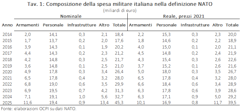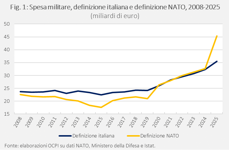 La definizione NATO di spesa per la difesa differisce da quella dei singoli Stati nazionali. La definizione italiana, quella del “Bilancio Integrato della Difesa”, comprende la spesa in personale, esercizio ed armamenti e gli stanziamenti in difesa dagli altri Ministeri e dal PNRR. In questa definizione la spesa è stata di 35,5 miliardi nel 2025, in crescita di 3,2 miliardi (9,8%) dal 2024.