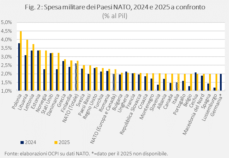 Nel 2025 tutti i Paesi NATO spenderanno almeno il 2% del Pil in difesa (Fig.2). Nel 2024 13 Paesi spendevano meno del 2%. Hanno ora raggiunto il traguardo Albania, Belgio, Bulgaria, Canada, Croazia, Italia, Lussemburgo, Montenegro, Macedonia del Nord, Portogallo, Slovacchia, Slovenia e Spagna.