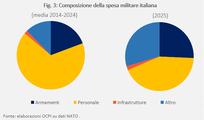 La voce “altro” ora rappresenta il 30% delle spese militari italiane (Fig. 3); tale quota è stata in media del 12% negli anni precedenti. Sale la quota degli armamenti (dal 22% al 26%), scende quella delle infrastrutture (dal 3% al 2%).