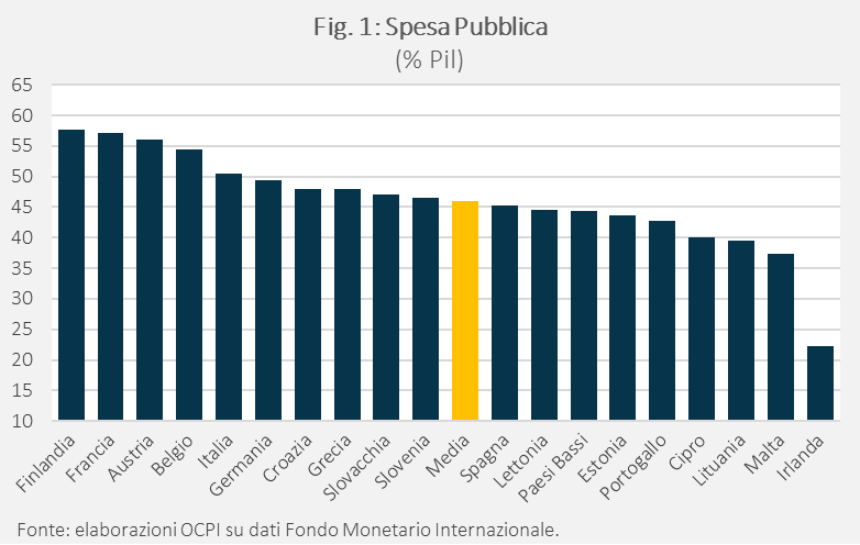 Nella graduatoria dei Paesi dell’eurozona con la più alta incidenza della spesa pubblica sul Pil l’Italia si colloca al quinto posto.[1] Nonostante significativi miglioramenti rispetto agli anni precedenti, nel 2024 il nostro Paese registrava una spesa pubblica pari al 50,6% del Pil, immediatamente dietro a Finlandia e Francia (circa il 57% del Pil), Austria e Belgio (rispettivamente 56% e 54%) e 4,6 punti sopra alla media dell’eurozona che si attesta al 46% del Pil (Fig. 1). Spicca la differenza (in peggio) rispetto ad alcuni Paesi, in particolare la Spagna (che si colloca al 45%), il Portogallo (43%) e, soprattutto, l’Irlanda (22%, ben 28 punti meno dell’Italia).